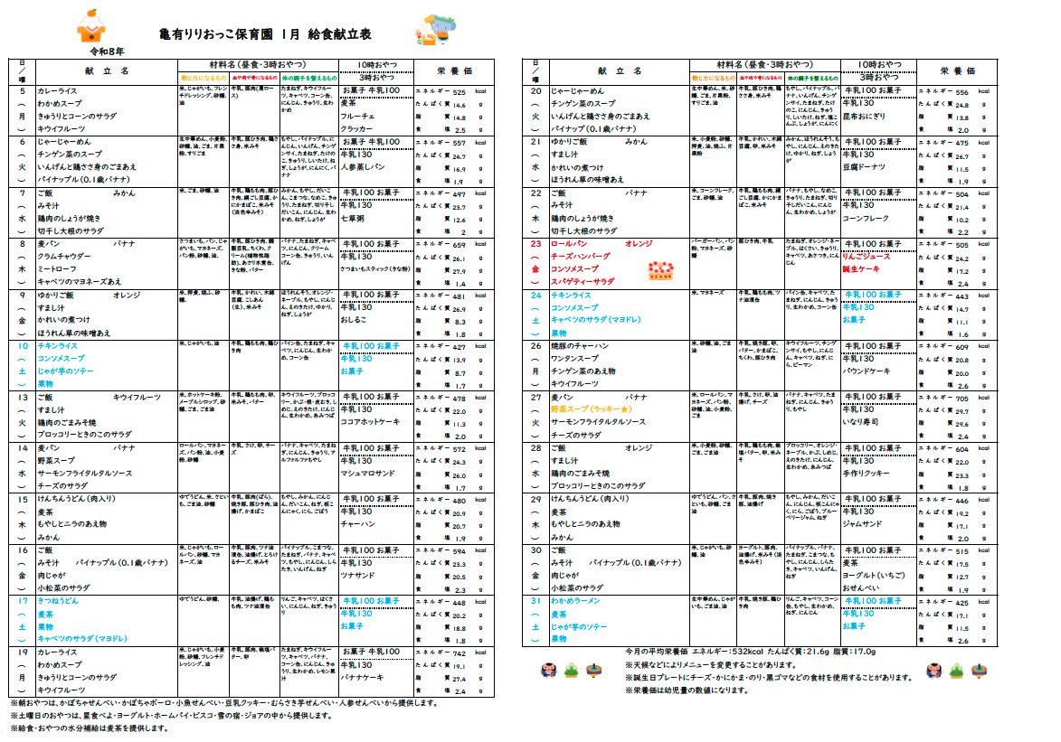 献立表【2026年1月号】を更新しました。 pdfはこちらからご覧ください。