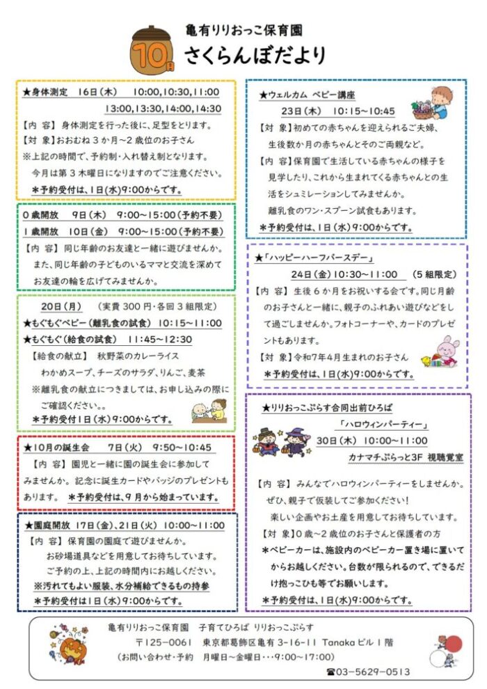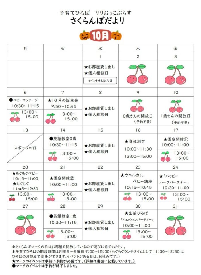 さくらんぼだより・イベントカレンダー【2025年10月号】を更新しました。 お知らせ さくらんぼだより【子育て支援センター】 2025.09.24 さくらんぼだより・イベントカレンダー【2025年10月号】を更新しました。 ※内容を一部訂正しております pdfはこちらからご覧ください。 SHARE TWEET LINE